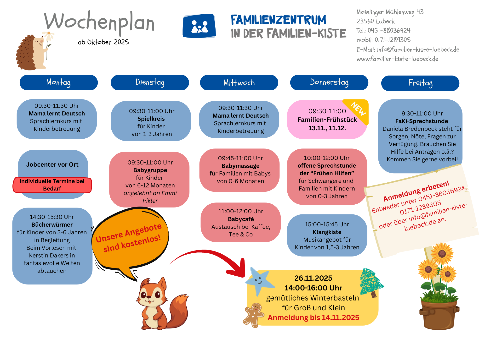 Das aktuelle Kurs-Angebot des Familienzentrums der Familien-Kiste ab Oktober 2025 ist da – schauen Sie mal in die Wochenübersicht mit zwei neuen Angeboten rein!